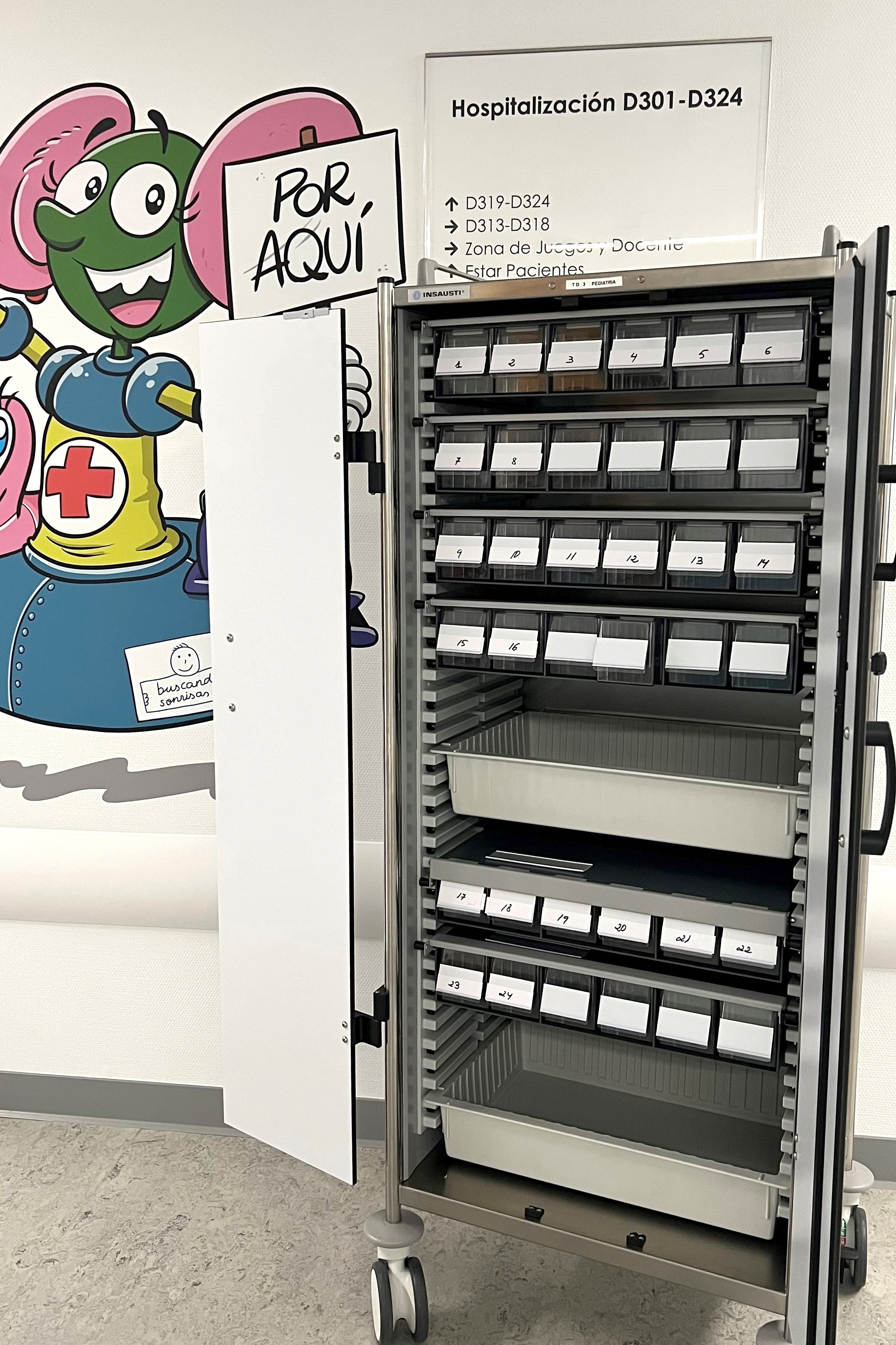 Este sistema de dispensación de medicamentos en el área de Pediatría permite que, para cada niño, exista un cajetín debidamente identificado en el que se depositan los fármacos que necesita en las próximas 24 horas. Por su parte, el Servicio de Farmacia del hospital es el responsable del reenvasado y etiquetado de todas las dosis de medicamentos que van a necesitarse en la planta de Pediatría. Los cajetines se trasladan diariamente al área pediátrica en los carros de medicación 'Nodriza'.