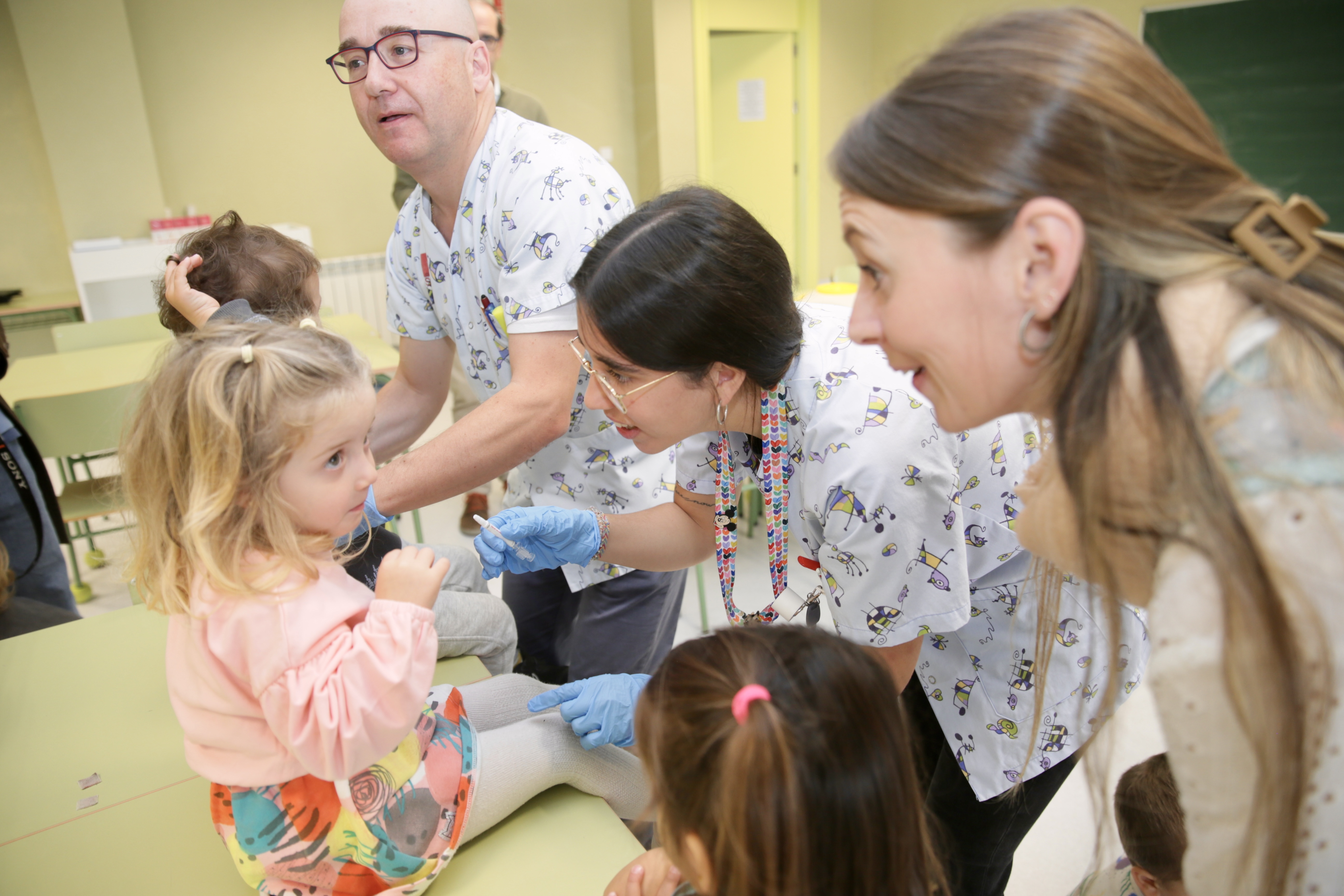 En esta ocasión, el equipo formado por el pediatra Luis Capa y los enfermeros Raúl Ayala y Claudia García Herrero han sido los encargados de inmunizar a los niños. Para ello se han valido de un vídeo animado que tiene como principal protagonista a 'Olfatín' un personaje recibe la misma vacuna intranasal que se administra a los pequeños y que "huele a palomitas".