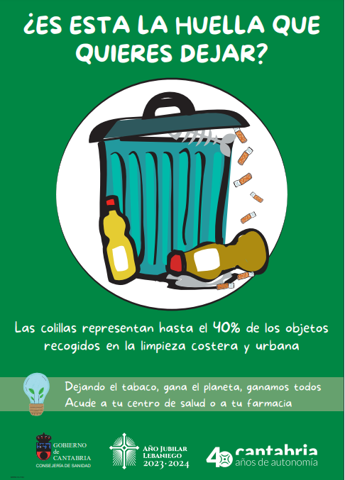 Este año 2022, la Consejería de Sanidad ha creado la campaña “¿Es esta la huella que quieres dejar?” invitando a quienes fuman a cuestionar si el tabaco y las colillas son la huella que quieren dejar en el planeta, buscando que la protección del medio ambiente sea un motivo más para dejar de fumar a través de mensajes visuales sencillos.
